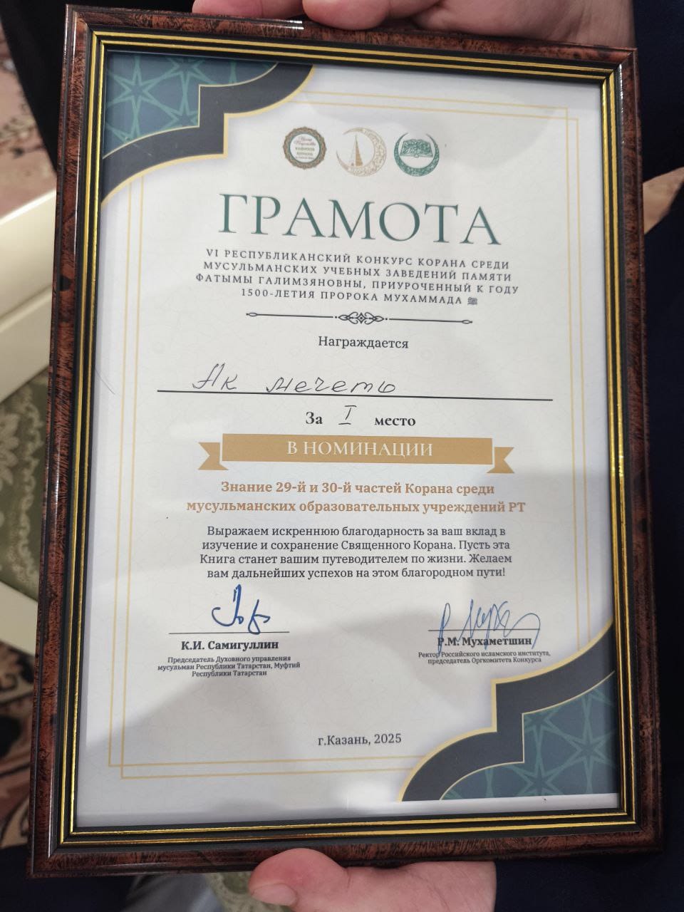Первое место на VI РЕСПУБЛИКАНСКОМ КОНКУРСЕ КОРАНА СРЕДИ МУСУЛЬМАНСКИХ УЧЕБНЫХ ЗАВЕДЕНИЙ